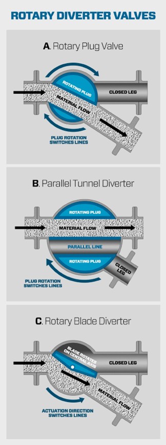 The rotary-plug diverter valve is typically used for handling pellets rather than powders, because powder can pack between the rotating plug and housing. Shifting the valve “on the fly” (that is, diverting material flow while the conveying system is operating) isn’t recommended, because it can cause the valve’s upstream conveying line to become completely blocked.